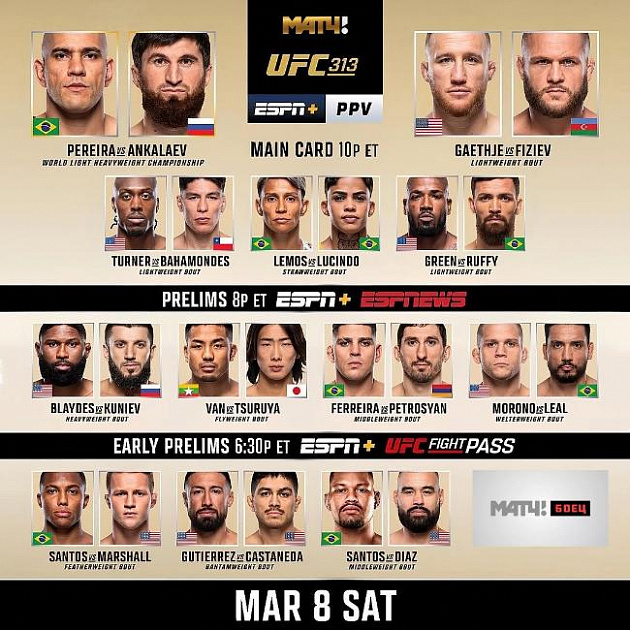 Турнир UFC 313 состоится в ночь на 9 марта в Лас-Вегасе. Главным событием вечера станет бой между Алексом Перейрой и Магомедом Анкалаевым. Представляем вашему вниманию актуальный кард турнира.