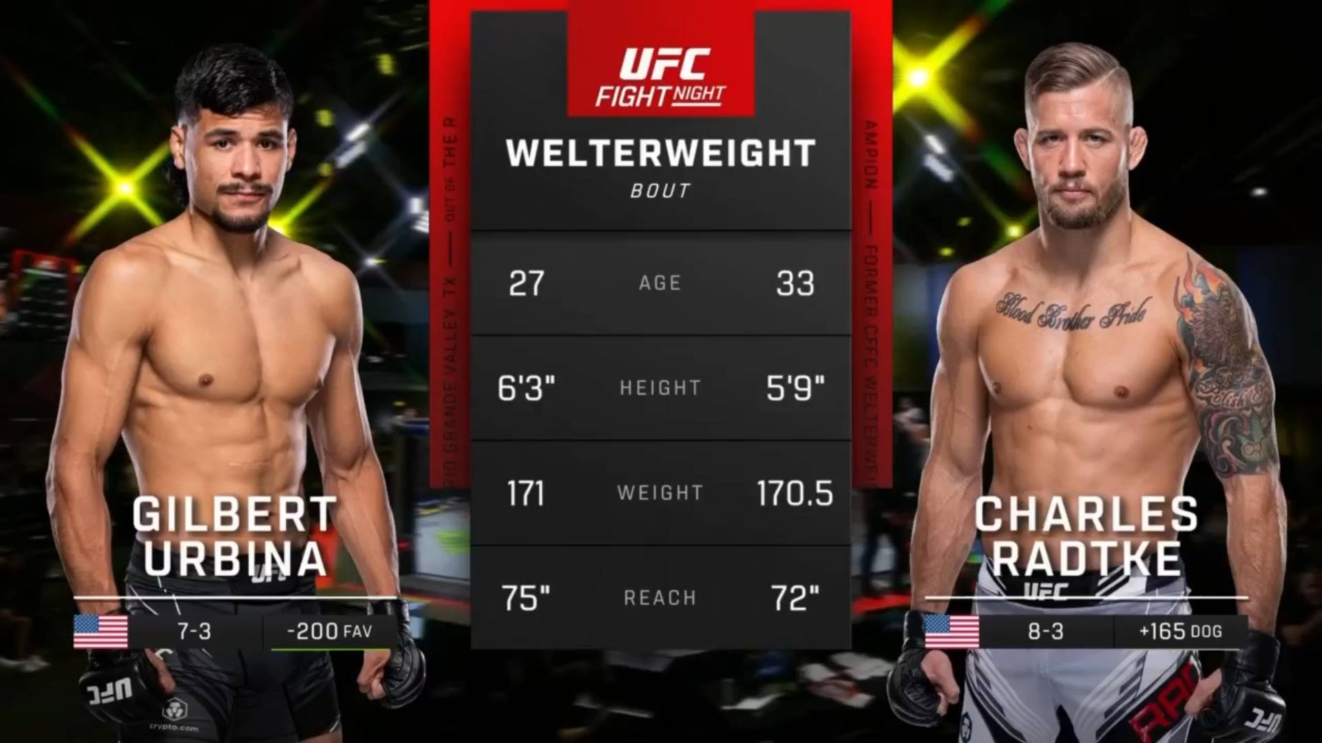 Чарли Радтке по прозвищу `Chuck Buffalo` представляет США, его рекорд – 10-4. Недавно он одержал досрочную победу техническим нокаутом над Мэттью Семельсбергером в той же весовой категории. Эта быстрая победа может мотивировать его попытаться одолеть Мэллотта в ранних раундах.