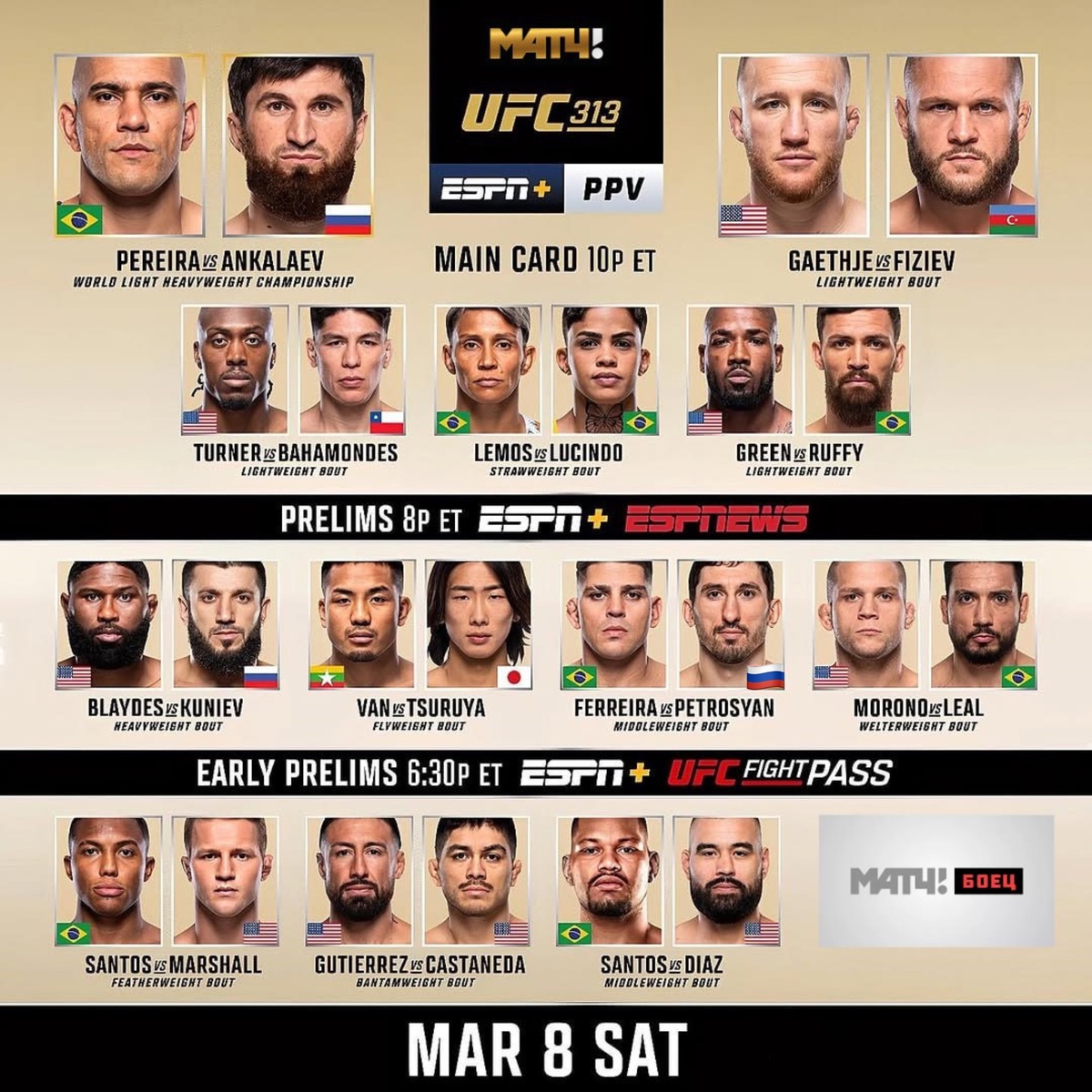 В рамках предварительного карда состоится бой в полулегком весе между Сантосом и Сан Ю. Этот поединок рассчитан на три раунда и не является главным событием вечера. Обратите внимание, что время выхода бойцов на ринг может измениться в зависимости от продолжительности предыдущих боев. Для зрителей из разных часовых поясов рекомендуется свериться с таблицей времени начала для вашей страны, чтобы не пропустить ни одного момента.