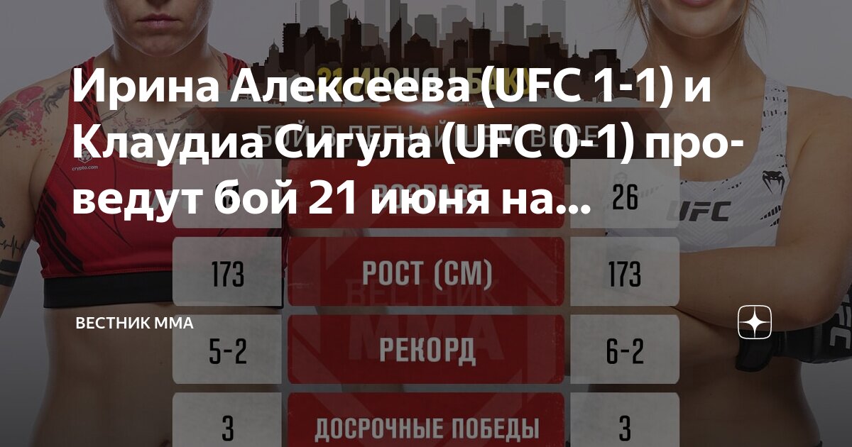 Ирина Алексеева готовится выйти на поединок против Клаудии Сигулы на арене Baku Crystal Hall в Азербайджане. Этот бой пройдет в рамках предварительного карда турнира UFC on ABC 8. Поклонники смешанных единоборств с нетерпением ожидают встречи этих талантливых представительниц легчайшего веса, особенно после того, как обе спортсменки потерпели поражения в своих последних боях от британки Мелиссы Маллинс.